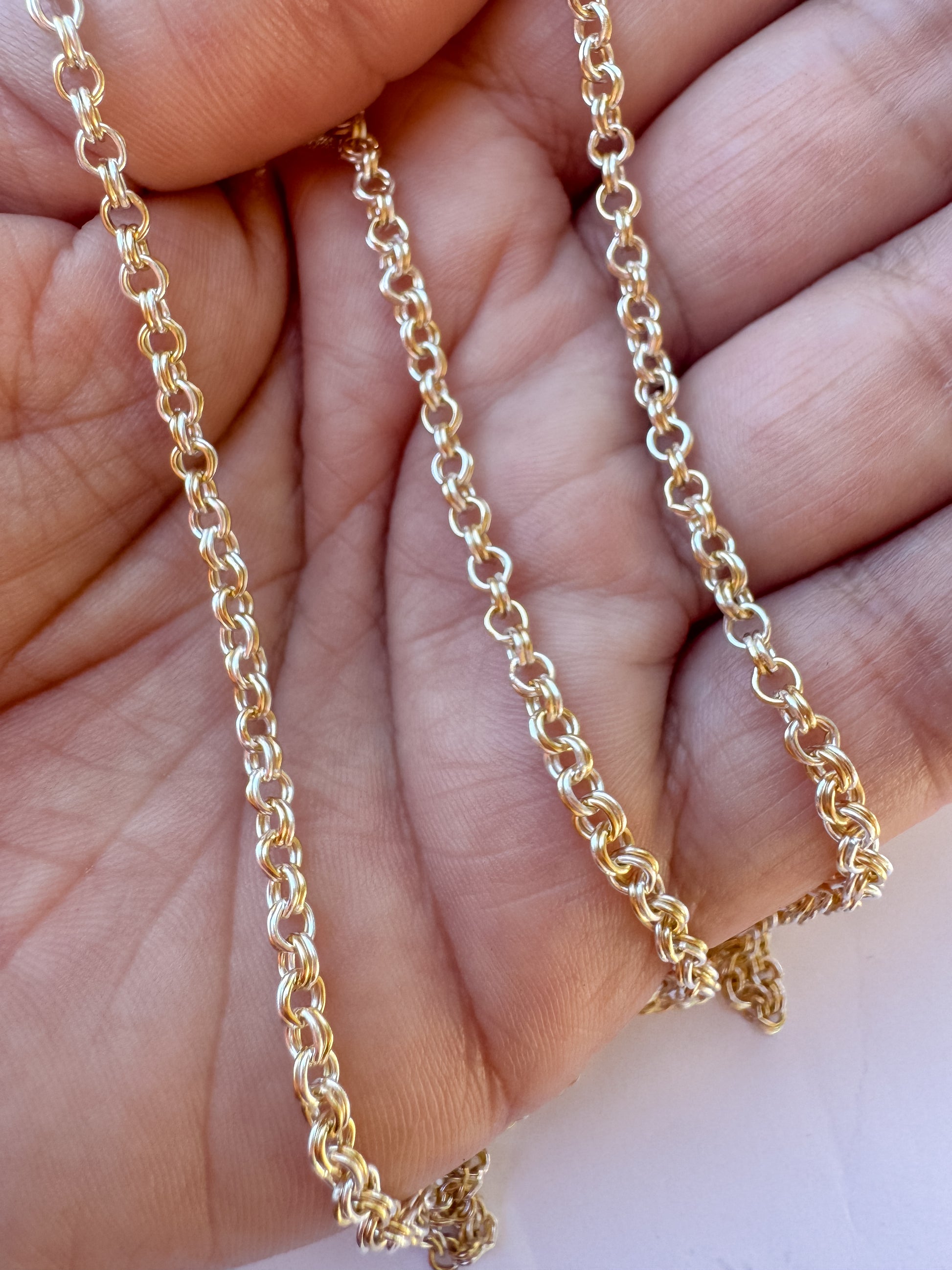 Designed with interlocking 14 karat gold filled and .925 sterling silver links, this mixed metal double cable chain creates a seamless blend of tones that catches the light from every angle. The two metals are woven together, giving it a rich, dimensional look that feels both bold and refined.