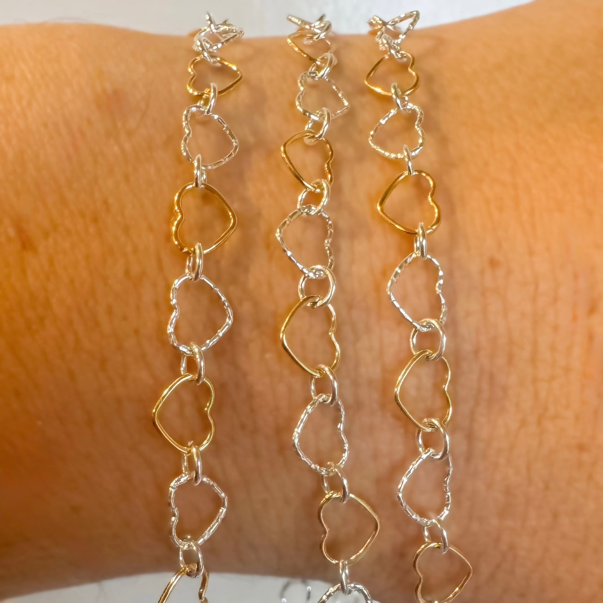 This mixed metal heart chain for permanent jewelry features interlinked, alternating diamond cut .925 sterling silver hearts and 14k gold filled hearts, forming one continuous, cohesive chain. The diamond cut finish adds subtle sparkle, while the mixed metals create depth and contrast that clients instantly notice.