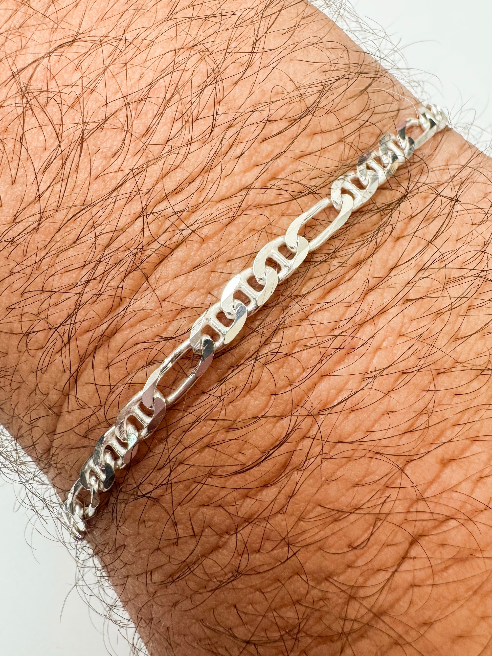 The Diamond Cut Figarucci Chain is a modern classic designed to live confidently in a men’s collection, yet effortlessly worn by anyone who appreciates a clean, strong silver chain. With its flat-link profile and elongated Figaro-inspired design, this chain sits smoothly against the wrist for comfortable, all-day wear.